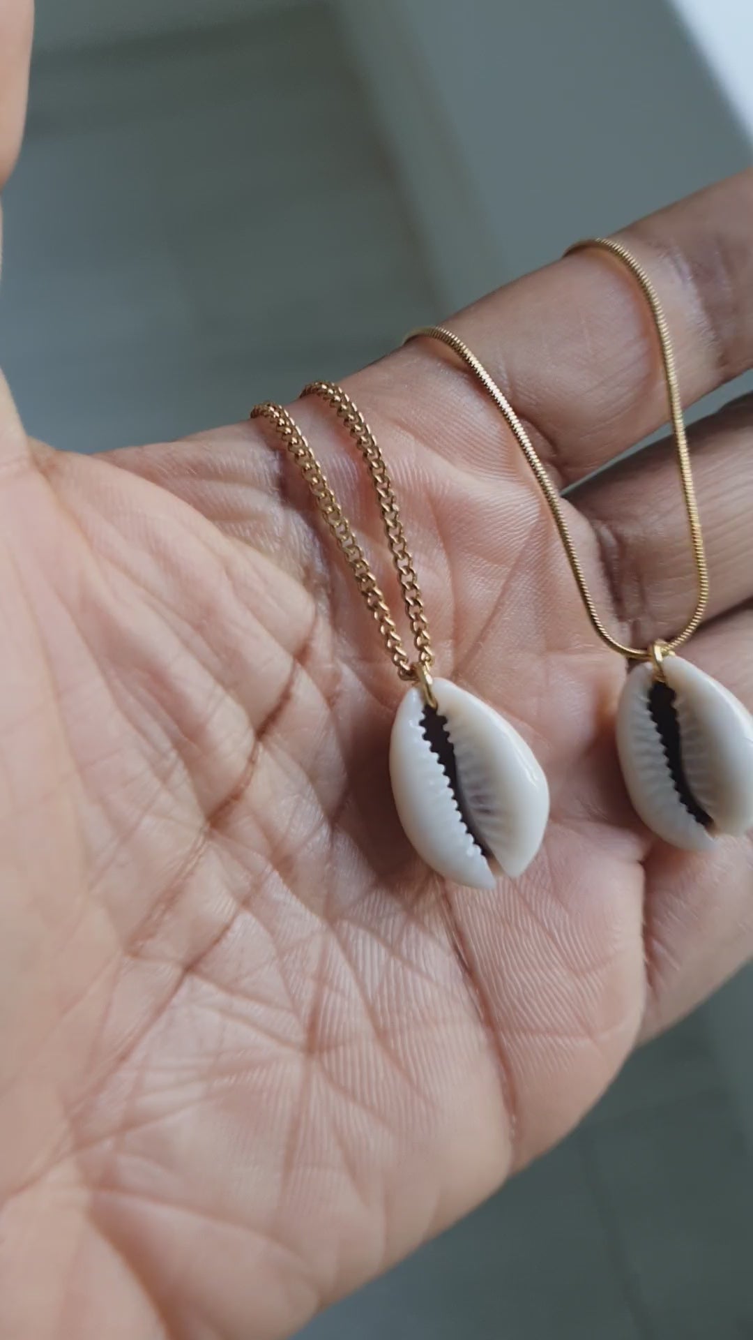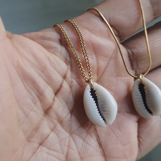 This necklace features a single cowrie shell, carefully selected for its smooth texture and creamy color, suspended from a delicate chain.