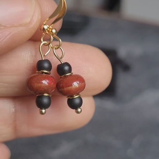 Our Red Clay Earrings, are minimal but bold. The pair are painted red with black accents. These earrings are perfect for everyday wear and also for adding a pop of colour to evening wear. They are light and delicate.